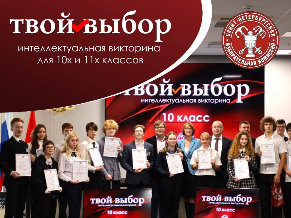 Интеллектуальная викторина «Твой выбор», посвященная избирательному процессу, пройдет в октябре 2025 года. В викторине примут участие учащиеся 10-х и 11-х классов общеобразовательных учреждений Санкт-Петербурга.
